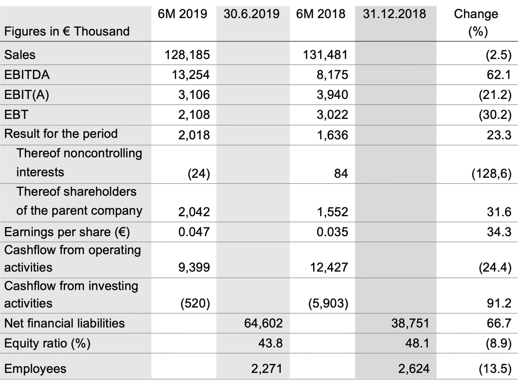 In the first half of 2019, sales were at € 128.2 million, which is 2.5% or € 3.3 million below prior year. Changes in sales are only partly caused by the challenging global economy. The main cause for the overall reduction were one-off transactions done in 2018 in the automated packing sector in Europe outside Germany.